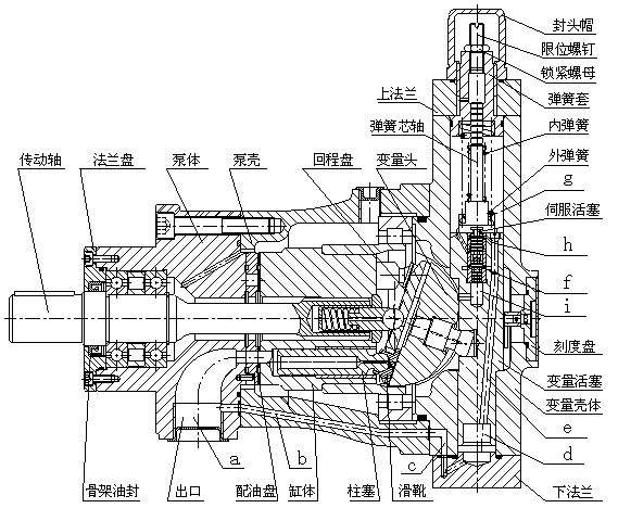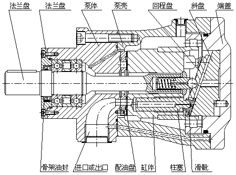 軸向柱塞泵是采用配油盤配油,缸體旋轉(zhuǎn),靠變量頭變量的斜盤式軸向柱塞泵。該泵采用液壓靜力平衡的最佳油膜厚度設(shè)計(jì),使缸體與配油盤、滑靴與變量頭之間處于純液體摩擦下運(yùn)轉(zhuǎn),具有結(jié)構(gòu)簡(jiǎn)單、體積小、噪音低、效率高、壽命長(zhǎng)和有自吸能力等優(yōu)點(diǎn)。